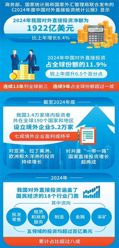 中国对外投资总体情况如何?商务部、国家统计局和国家外汇管理局不久前联合发布的《2024年度中国对外直接投资统计公报》显示,中国已连续13年位列全球对外直接投资流量前三,对外投资大国地位日益稳固。