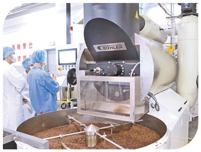 正大·兴隆咖啡文化园的全自动生产线上,咖啡豆正在被加工。 |