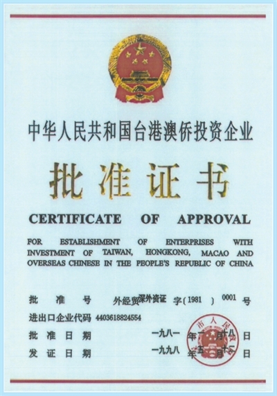 “外经贸深外资证字〔1981〕0001号”批准证书。 |