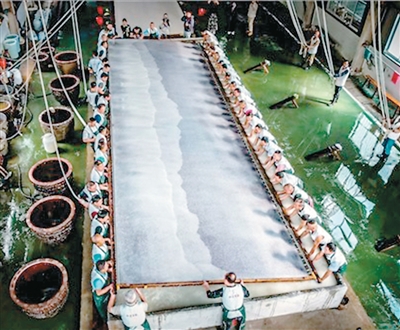 而制作巨幅“三丈三”宣纸时,更需44人站槽、8人拉绳,52人协同作业,相同分工者动作整齐划一,两组之间周密呼应。