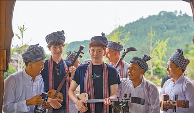 欧洲青年音乐人在贵州省从江县高增乡小黄村鼓楼参与侗族行歌坐月表演。 |