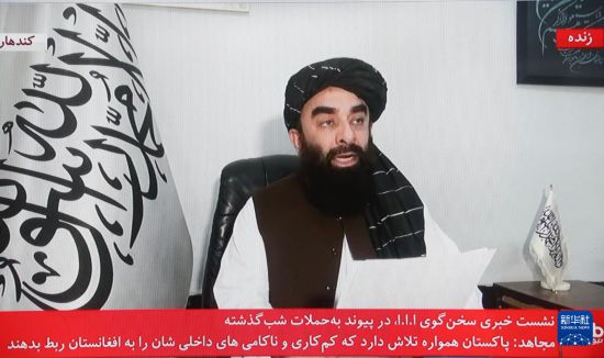 这是2月27日在阿富汗喀布尔拍摄的阿富汗政府发言人穆贾希德在新闻发布会上发言的电视画面。新华社发(塞夫拉赫曼·萨菲摄)