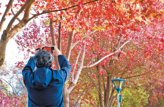 秋光里,游客用手机拍下玉渊潭绚烂一刻。本报记者 刘平摄