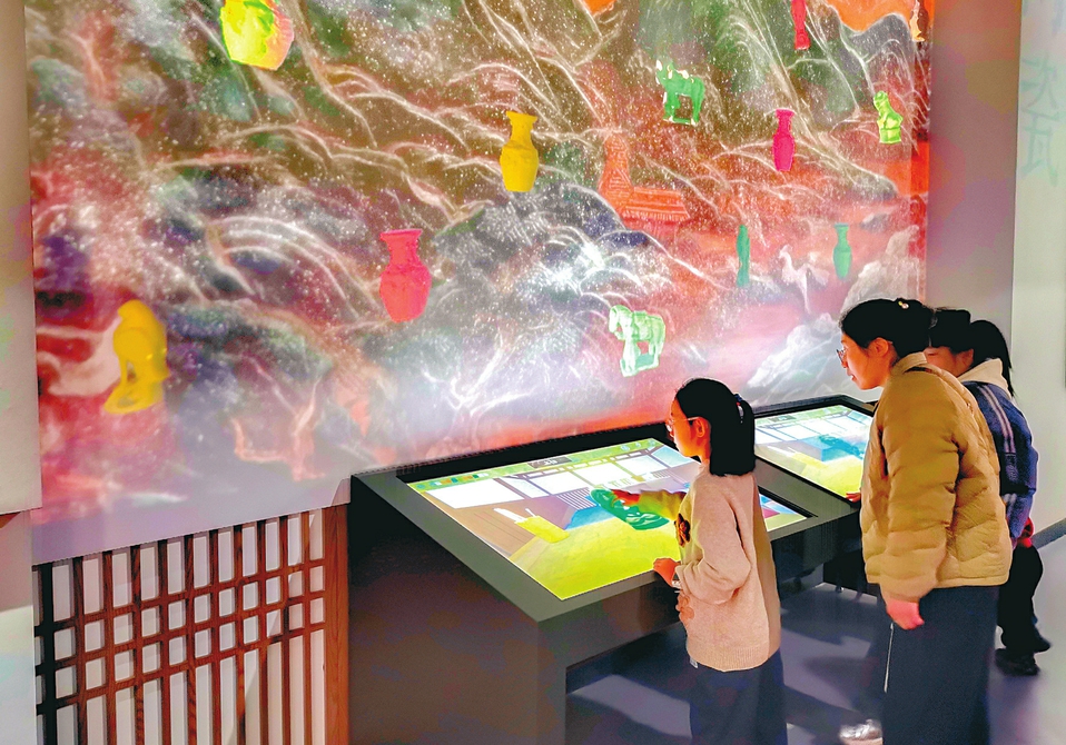 1月16日,长治市博物馆琉璃艺术馆内,游客在数字触摸屏上体验琉璃上釉工艺。长治市博物馆新馆自元旦面向公众试运行以来,市民争相打卡游览,感受上党地区的历史文化魅力。(记者王少杰摄)