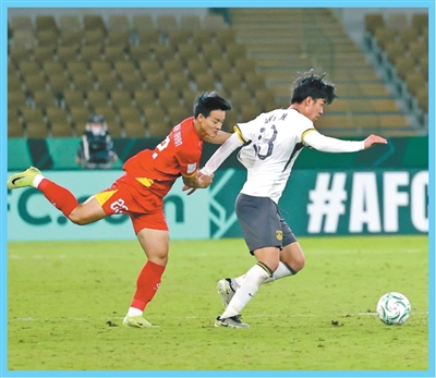 U23男足亚洲杯半决赛,中国队球员王博豪(右)在比赛中拼抢。