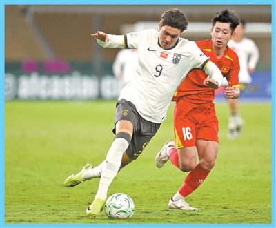 U23男足亚洲杯半决赛,中国队球员拜合拉木(左)在积极拼抢。