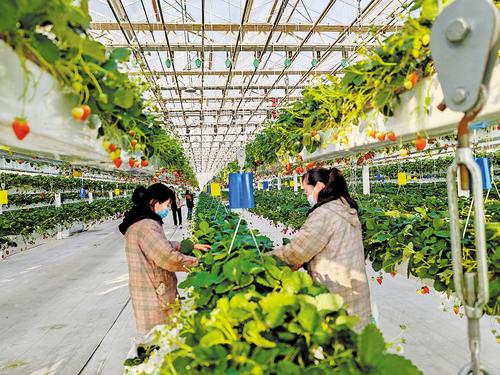 1月15日,雄安新区高宇农业园的玻璃温室内,工作人员正在采摘草莓。 河北日报见习记者 康晓博摄